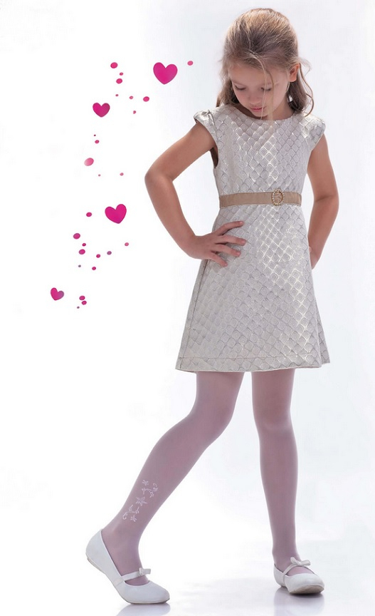 Колготки для дівчаток з пряжі спандекс. Тонкий малюнок над щиколоткою. Блискуча нитка у візерунку. Прозорий, напівматовий. Ідеально підходить для особливих випадків, таких як причастя. Товщина 20 ден. Склад: 88% поліамід, 10% еластан, 1% бавовна, 1% металізоване волокно