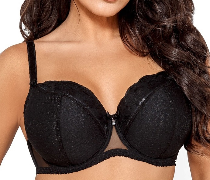 Бюстгальтер із жорсткими чашками з ніжної сітки, прикрашений красивою вишивкою з квітковим мотивом - на їх з'єднанні атласний бант з ювелірним елементом. Бічні сторони з гладкої тканини, посилені вертикальною підкладкою, ремінці не знімаються.
