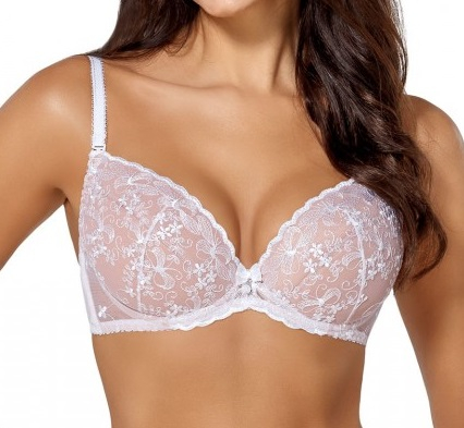 Жіночий бюстгальтер push-up з ніжно-білої сітки, прикрашений вишивкою, підбитий пудрово-бежевою сіткою. Сторони, зміцнені вертикальною підкладкою. Знімні погони, знімні прокладки. Склад: 88% поліамід, 8% бавовна, 4% еластан.