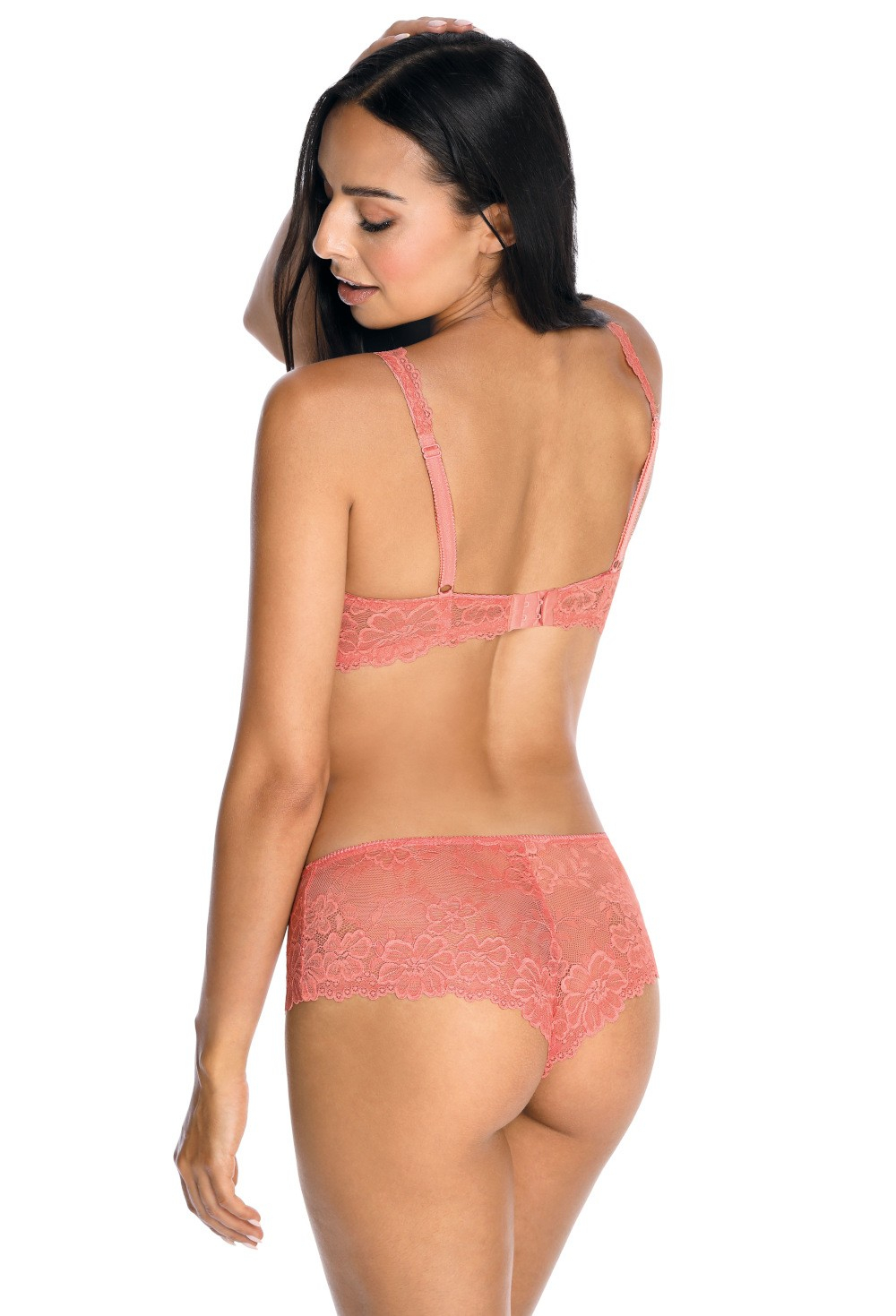 Жіночий м'який бюстгальтер з мережива з квітковим малюнком. Внутрішня частина чаші обшита бавовною. Мереживні бортики. Декоративні, регульовані ремінці, не знімні. Склад: 44% поліамід, 17% бавовна, 17% поліестер, 17% поліуретан, 5% еластан.