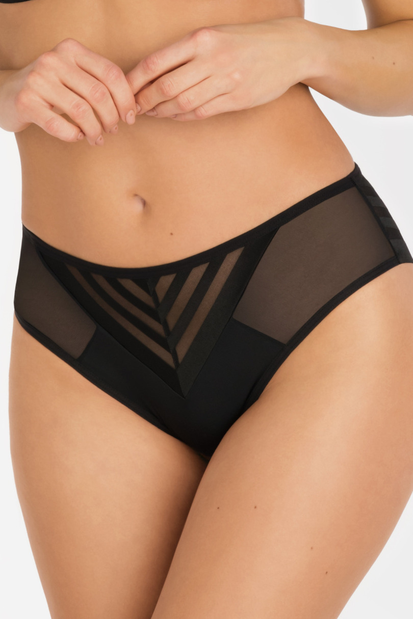 Бразильські трусики з внизу наближеним станом, які відкривають і підкреслюють сідниці. ПЕРЕД: еластичне мереживо зі смужками, по боках еластичний тюль, нижня частина з мікрофібри з приховуючим ефектом, ніжки оздоблені вузькою еластичною стрічкою. ЗАД: ніжки оздоблені краєм мережива, зверху вставка з мікрофібри з приховуючим ефектом. Пояс оздоблений ширшою еластичною стрічкою.