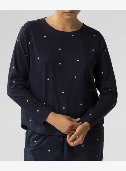 Жіноча піжама з довгим рукавом та довгими штанами з ніжним візерунком у формі сердечок. Светр має зр..
