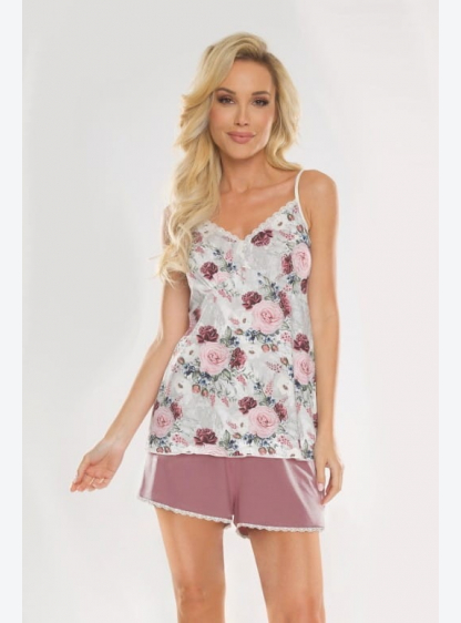 Жіноча піжама з ніжної віскози. Футболка на вузьких регульованих лямках, прикрашена візерунком різно..