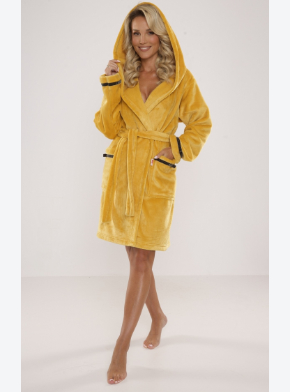 Короткий жіночий халат з капюшоном, виготовлений з м'якої тканини. Кишені та манжети з оксамитовою в..