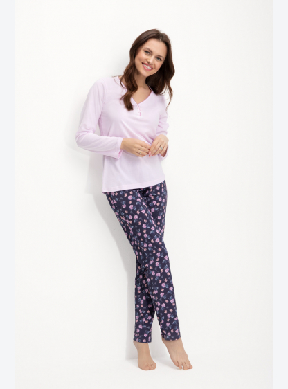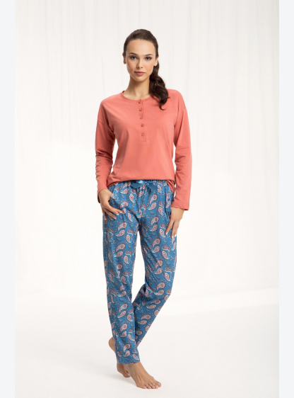 Жіноча піжама Luna, довгі брюки з принтом, кишені, одноколірна футболка, горловина застібається на г..