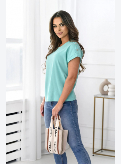 Жіноча блузка з короткими рукавами та декоративною складкою на кнопках. Виготовлена з еластичної та ..
