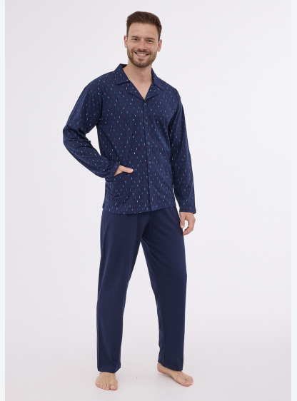 Класична чоловіча піжама з довгим рукавом і коміром, застібається на блискавку. Кишені на рівні стег..