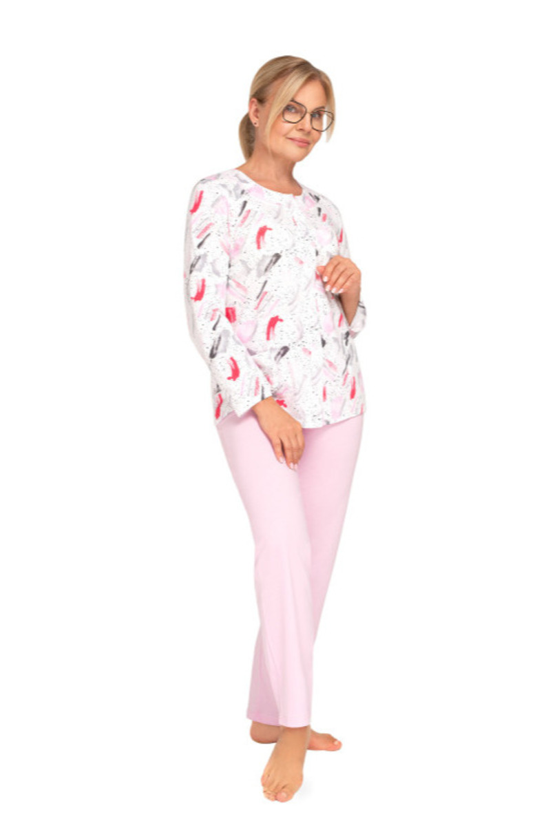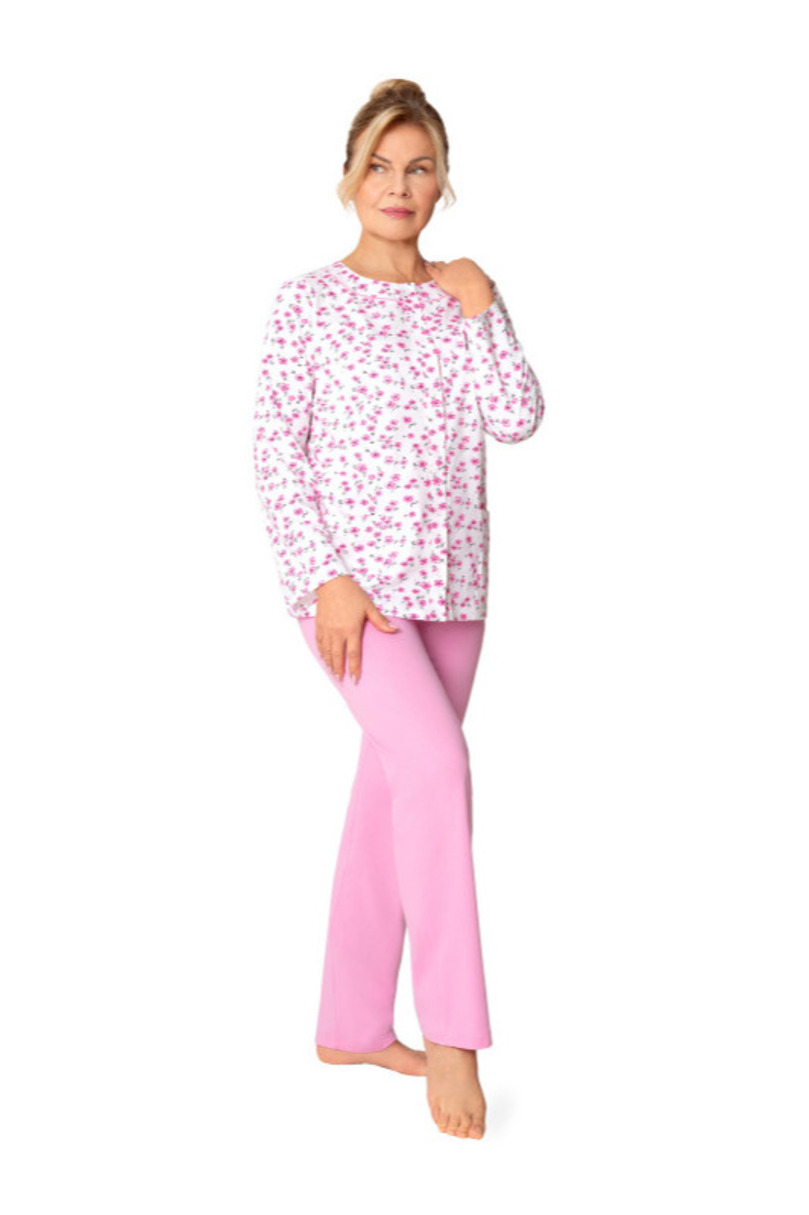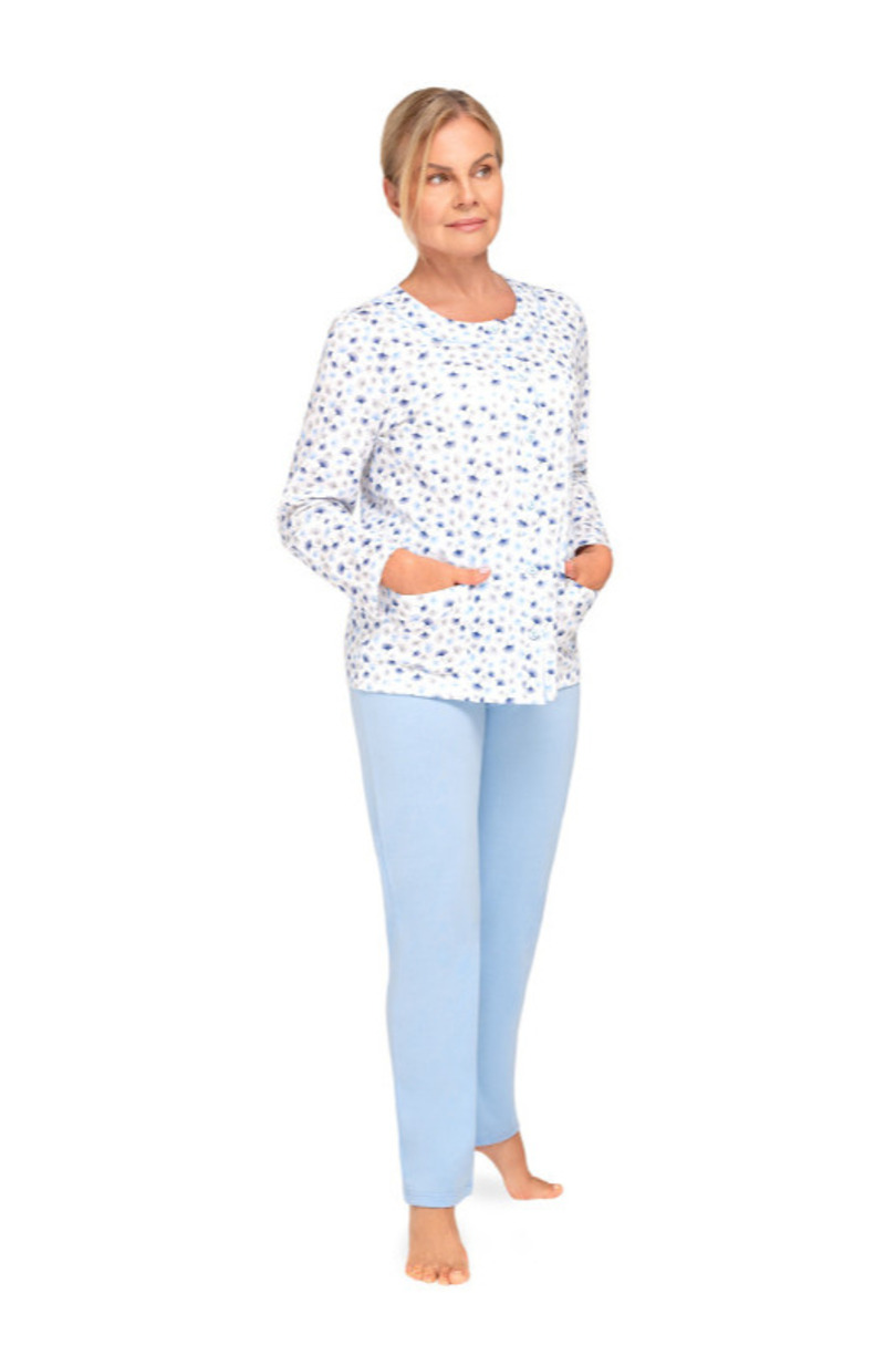 Зручна і елегантна жіноча піжама з 100% натуральної бавовни, що забезпечує комфорт і повітропроникність. Топ з довгими рукавами, застібається на гудзики, прикрашений тонким квітковим візерунком, додає всьому ніжного шарму. Однотонні сині штани мають простий вільний крій, що забезпечує свободу рухів і комфорт носіння. Це ідеальний вибір для прохолодних ночей і ранкових хвилин відпочинку. Ідеально підходить як для сну, так і для відпочинку вдома. Склад: 100% бавовна