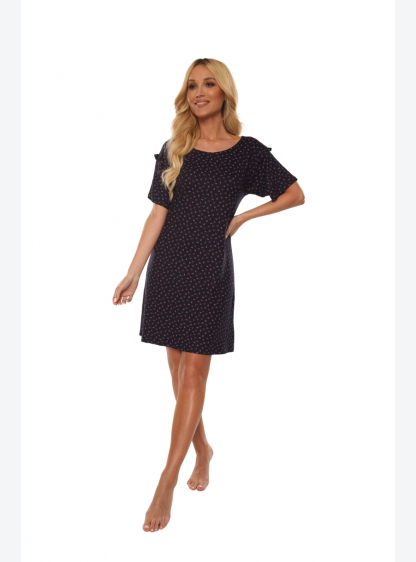 Нічна сорочка з бантами з приємної віскози. Короткі рукава, прикрашені воланами. Довжина вище коліна..