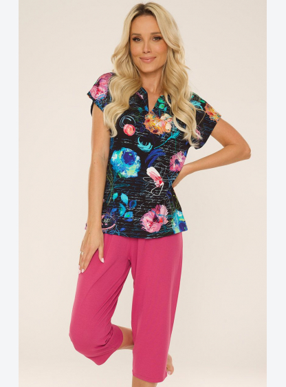 Зручна та стильна жіноча піжама з віскози. Футболка з коротким рукавом і красивим візерунчастим прин..