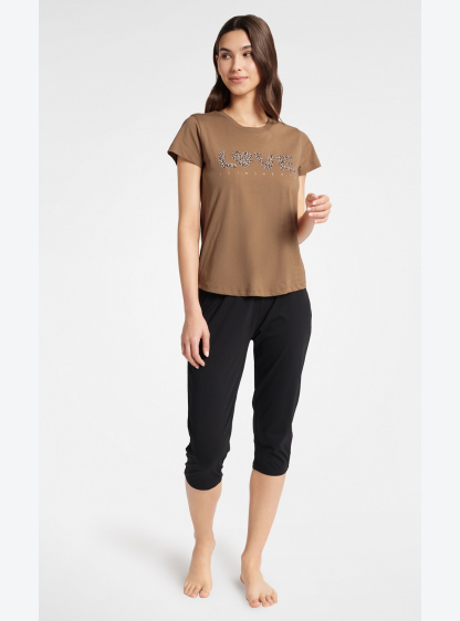 Жіноча піжама з високоякісної бавовни. Блуза з коротким рукавом декорована аплікацією, штани однотон..