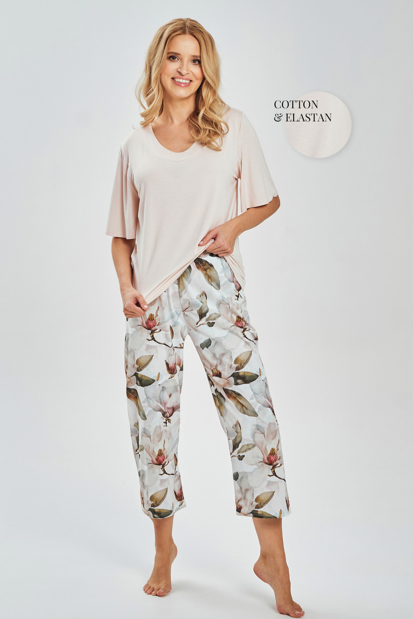 Жіноча піжама AFRODYTA 3535 – це елегантний та надзвичайно зручний варіант для жінок, які цінують поєднання жіночного стилю та комфорту. Однотонний верх виготовлений з м’якої бавовни з додаванням еластану, що забезпечує ідеальну посадку та свободу рухів. Рукава до ліктя, м’яко хвилясті, додають легкості та витонченої елегантності, а вищий виріз горловини красиво підкреслює лінію декольте. Штани довжиною 7/8 мають яскравий барвистий квітковий принт, що додає піжамі свіжості та романтичності. Зручний еластичний пояс з бавовняною обробкою забезпечує ідеальну посадку без тиску. Піжама AFRODYTA ідеально підходить як для сну, так і для відпочинку вдома, а також може стати стильним та практичним подарунком.