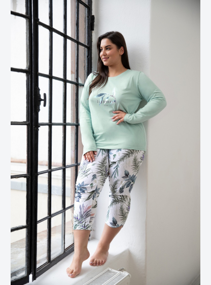 Жіноча піжама з високоякісної бавовни. Штани в сіточку з рукавом 3/4, з малюнком. Блуза декорована н..