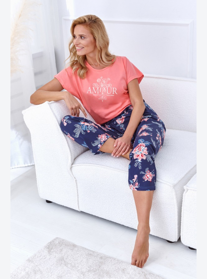 Жіноча піжама з високоякісної бавовни. Гладка блузка з коротким рукавом, брюки 7/8 з малюнком. Склад..