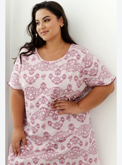 Жіноча сорочка з високоякісної бавовни прикрашена блискучим принтом. Круглий виріз, довжина до колін..