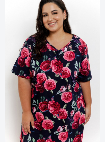 Жіноча сорочка з високоякісної бавовни прикрашена квітковим принтом. Короткі рукави, V-подібний вирі..