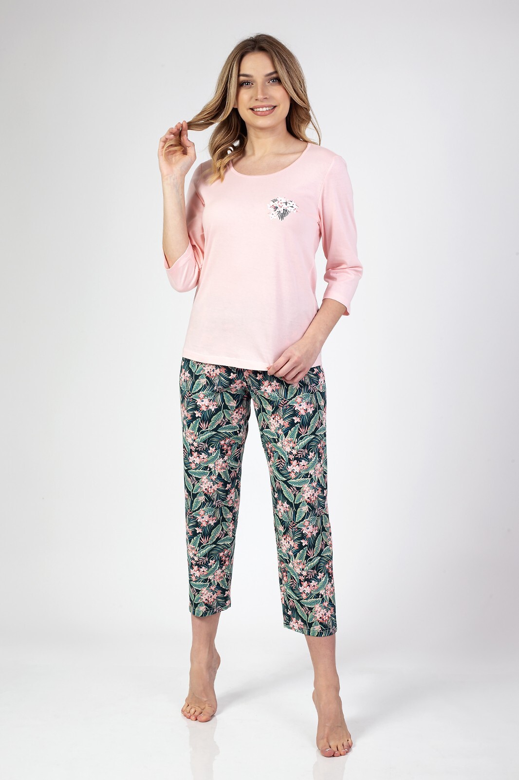 Жіноча піжама з рукавом 3/4, спереду прикрашена принтом. У комплект входять штани з малюнком довжиною 3/4. Склад: 100% бавовна