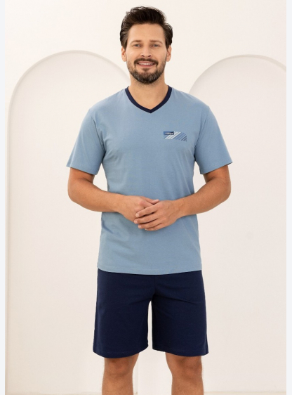 Чоловіча бавовняна піжама – м’яка, дихаюча та приємна для шкіри. Футболка з короткими рукавами, V-по..