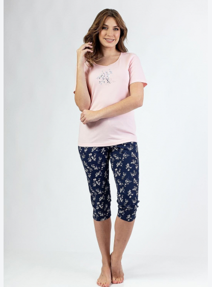 Бавовняна піжама для жінок. Футболка з круглим вирізом та рукавами 3/4, декоративний квітковий принт..