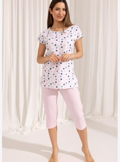 Жіноча бавовняна піжама. Футболка з коротким рукавом в горошок. Штани промежові, форма. Склад: 100% ..