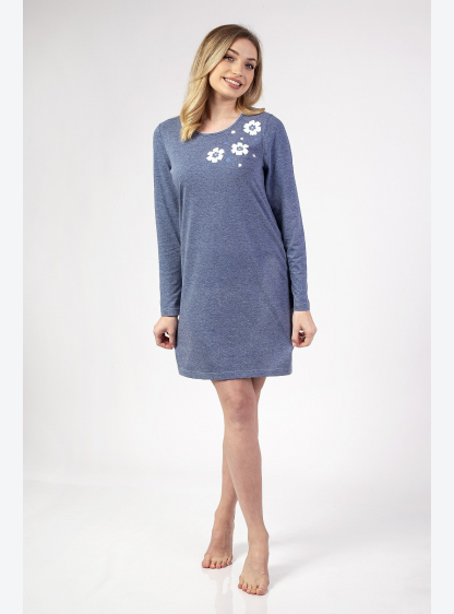 Жіноча бавовняна сорочка з принтом спереду та напівкруглим вирізом. Довгий рукав, довжина вище колін..