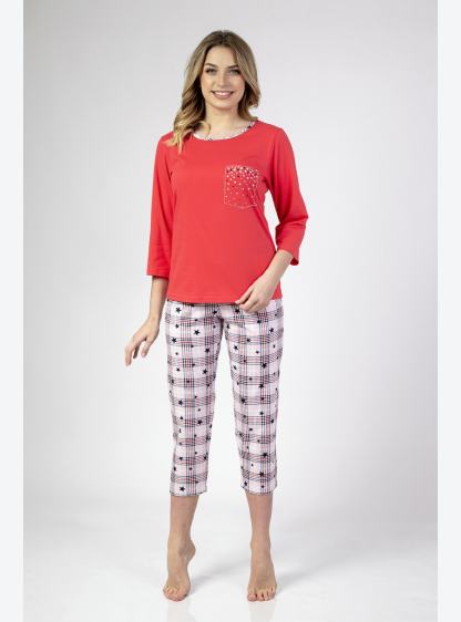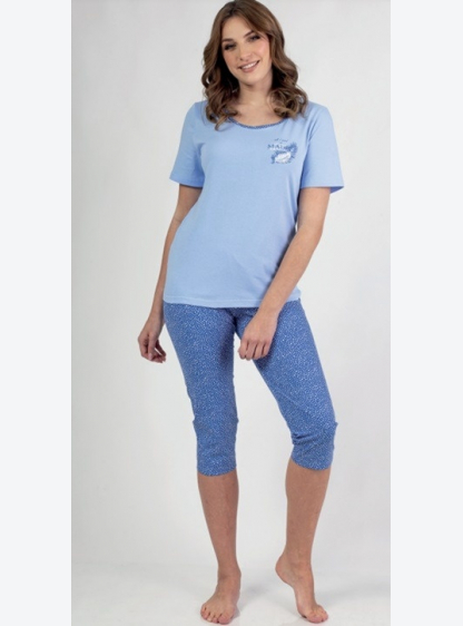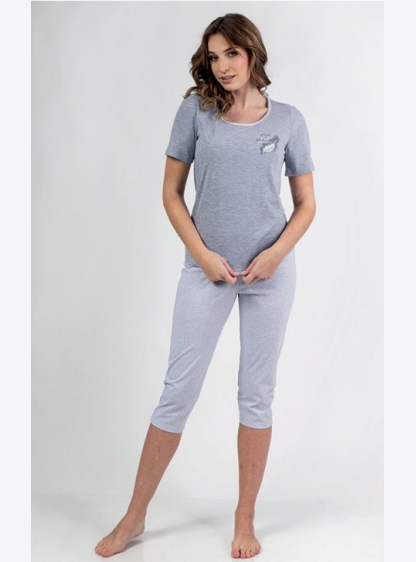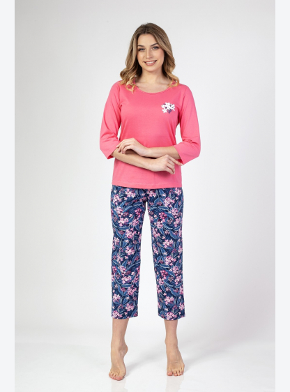 Жіноча піжама з рукавом 3/4, спереду прикрашена принтом. У комплект входять штани з малюнком довжино..
