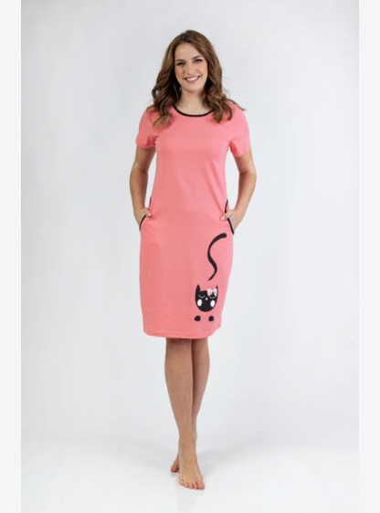 Жіноча бавовняна сорочка з коротким рукавом. Круглий виріз горловини, бічні кишені, довжина до колін..