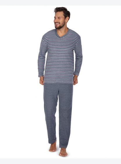 Тепла чоловіча піжама з махрової тканини. Футболка в смужку з довгими рукавами і V-подібним вирізом,..