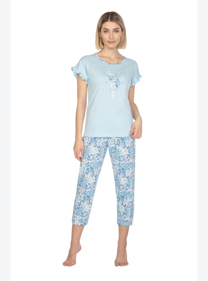 Жіноча піжама з високоякісної бавовни. Футболка з коротким рукавом, прикрашена принтом. Штани рибалк..