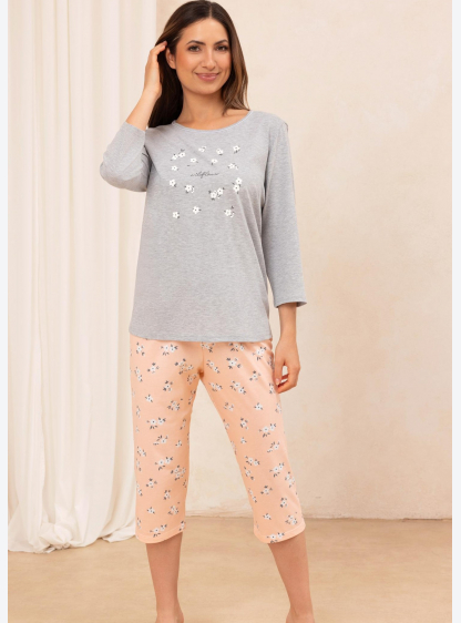 Бавовняна піжама для жінок. Футболка з круглим вирізом та рукавами 3/4, декоративний квітковий принт..