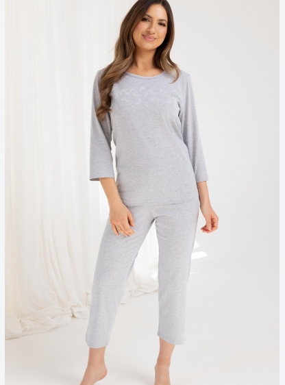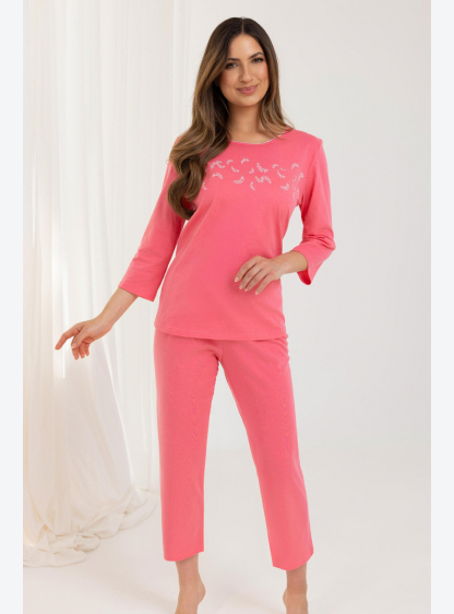 Жіноча бавовняна піжама. Верхній одяг має футболку з рукавами 3/4, круглим вирізом та декоративним п..