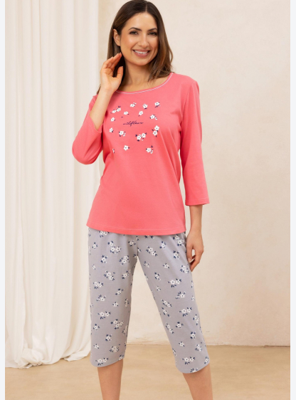 Бавовняна піжама для жінок. Футболка з круглим вирізом та рукавами 3/4, декоративний квітковий принт..
