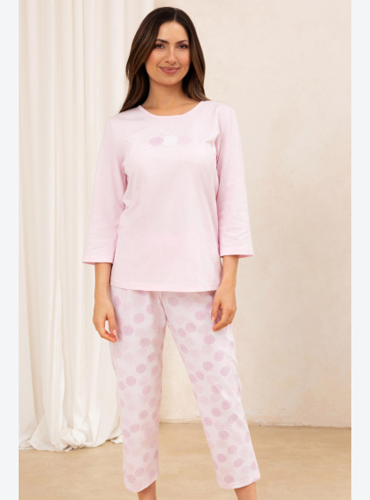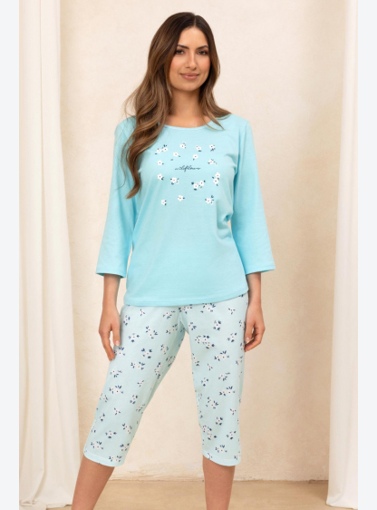 Бавовняна піжама для жінок. Футболка з круглим вирізом та рукавами 3/4, декоративний квітковий принт..