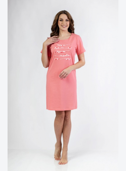 Жіноча бавовняна сорочка з коротким рукавом. Круглий виріз горловини, бічні кишені, довжина до колін..