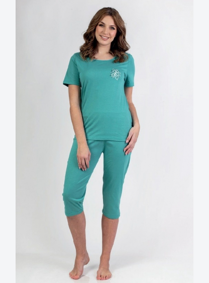 Жіноча піжама з високоякісної бавовни. Футболка з витонченою аплікацією на грудях, короткими рукавам..