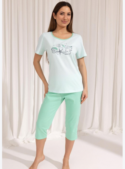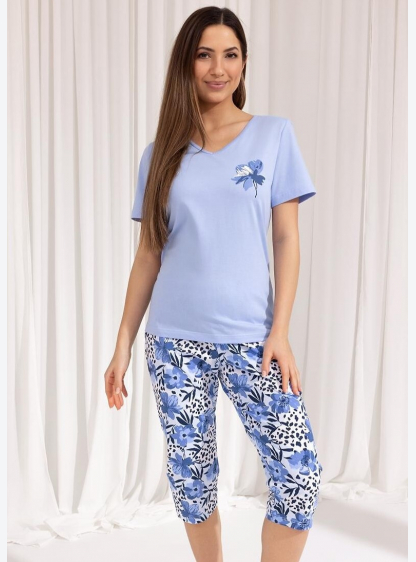 Жіноча піжама з короткими рукавами, круглим вирізом, спереду прикрашена ніжним принтом. Однотонні бр..