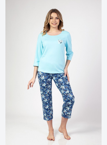 Жіноча піжама з рукавом 3/4, спереду прикрашена принтом. У комплект входять штани з малюнком довжино..