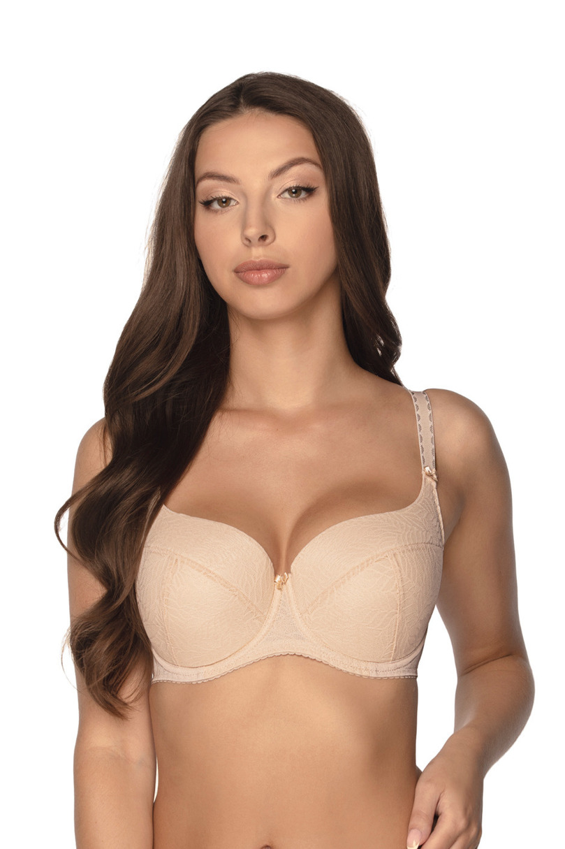 Бюстгальтер з підкладкою, чашечки обтягнуті ніжним мереживом, бретельки регулюються, не відстібаються. Вся чаша стає жорсткою. Конструкція на баветі, тобто спинка з'єднується безпосередньо з центром під чашею. На цьому з’єднанні пришита миска, профільована дротом, який оточує грудку. Миска середньої форми. Виріз горловини у формі тюльпана. Широко розставлені лямки. Нижня частина чашок має вертикальний виріз, який піднімає та підкреслює бюст. Бічна частина верхньої миски, розширена до лямки, підтримує і збирає груди всередину. Центр середньої висоти ідеально прилягає до грудної кістки. Склад: 39% поліамід, 33% поліестер, 13% еластан, 12% бавовна, 3% поліуретан.