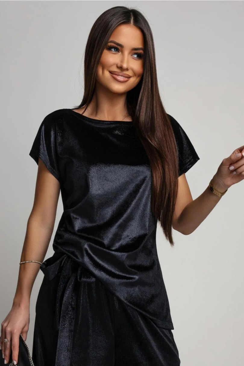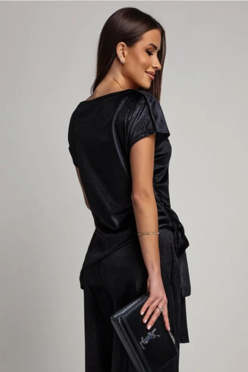 Елегантна жіноча блузка з коротким рукавом, розроблена для жінок, які цінують стиль, комфорт та витончену елегантність. Виготовлена з м'якого, блискучого матеріалу, схожого на замшу, вона чудово драпірується по фігурі та додає їй унікальності. Найяскравішою особливістю блузки є тонкі рюші з правого боку. Цей продуманий дизайн не тільки створює асиметричний, модний крій, але й майстерно приховує будь-які недоліки фігури, візуально зменшуючи талію. Ця блузка ідеально підходить як для повсякденного, так і для більш елегантного образу — у поєднанні з приталеними брюками, спідницею або піджаком вона створює ідеальний ансамбль для зустрічі, роботи чи вечірнього виходу. Це чудовий варіант для жінок, які хочуть виглядати стильно та бездоганно.