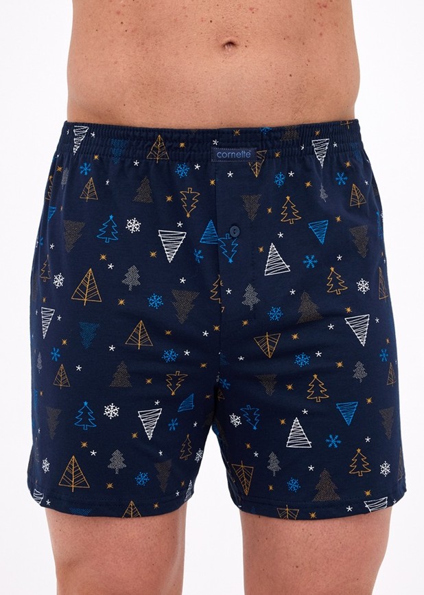Чоловічі боксерські шорти вільного крою, прикрашені принтом у вигляді ялинки з ніжним святковим акцентом. Зручний еластичний пояс з бавовняною обробкою. Застібається на ґудзики. Упаковані в коробку, ідеально підходять для подарунка. Склад: 100% бавовна.