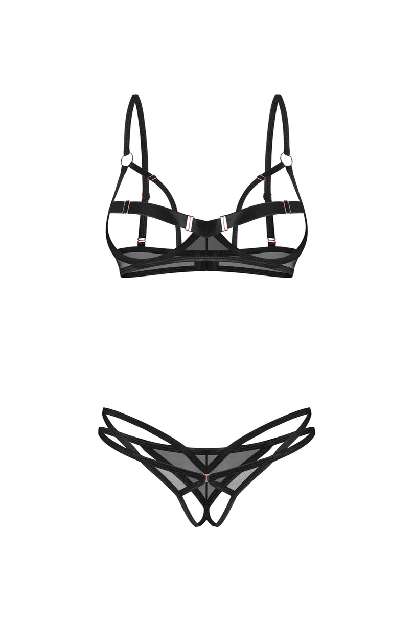 Будьте сміливими та впевненими з унікальним комплектом Euridia з відкритим спереду. Цей чуттєвий комплект із чорного бюстгальтера та стрінгів призначений для жінок, які відмовляються від компромісів. Прозорий матеріал ніжно відкриває тіло, а геометричні бретельки та деталі кольору рожевого золота додають розкішного штриха. Регульовані бретельки та застібки забезпечують ідеальну посадку, комфорт та неймовірно сексуальний образ. Ця білизна створена, щоб підкреслити автентичність, чуттєвість та силу жіночої краси.