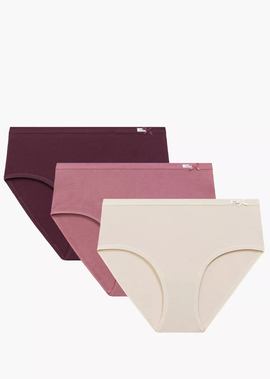 Трусики класичного крою з високою талією, оздоблені некомпресивною окантовкою з логотипом Atlantic та невеликим бантом, широкими боками та повною, закритою спиною. 3 штуки в упаковці. Склад: 95% бавовна, 5% еластан.