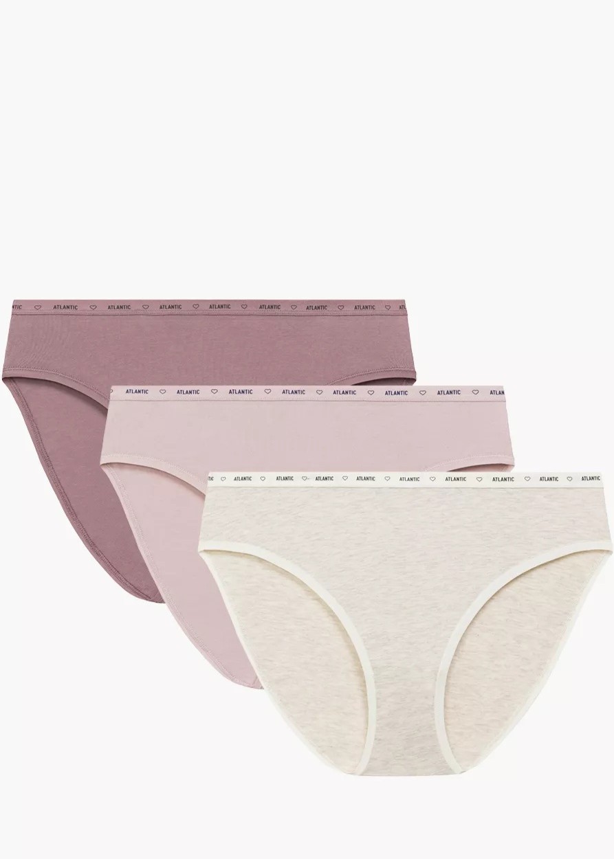 Білизна має високу талію, підкреслену м'яким, не стискаючим подолом, прикрашену атлантичними написами та сердечками, глибокі вирізи з боків та закриту спинку. 3 штуки в упаковці. Склад: 90% бавовна, 10% еластан.