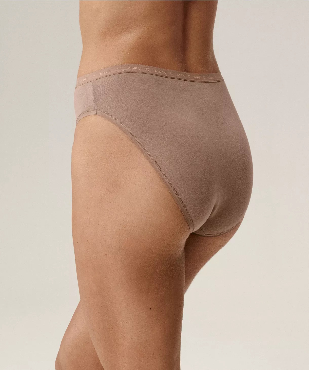 Трусики мають високу талію, позначені м'якою, ніжною, не стискаючою обробкою, декоровані написом Atlantic та сердечками, глибокі вирізи з боків та закриту спинку. У комплект входять 3 трусики. Склад: 95% бавовна, 5% еластан.