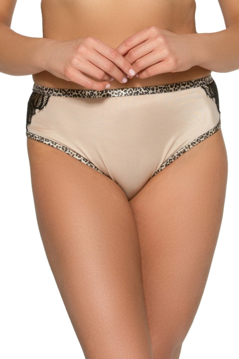 Класичні жіночі труси, спереду з гладкої мікрофібри, боки оздоблені мереживом. Оздоблення з візерунком у плями леопарда, спина оброблена подвійним тюлем. Склад: 91% бавовна, 5% бавовна, 4% еластан.