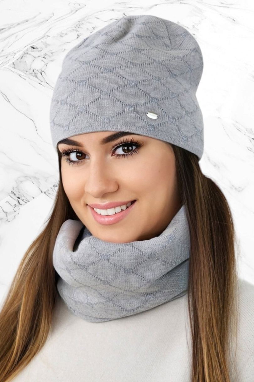 Stylowy i elegancki komplet składający się z czapki i komina typu tuba. Charakteryzuje go błyszczący geometryczny wzór, zwieńczony blaszką z firmowym logo. Dodatek bawełny w składzie sprawia, że komplet jest niezwykle miękki oraz świetnie oddaje komfort cieplny. Skład: 50% bawełna, 40% akryl, 10% poliamid