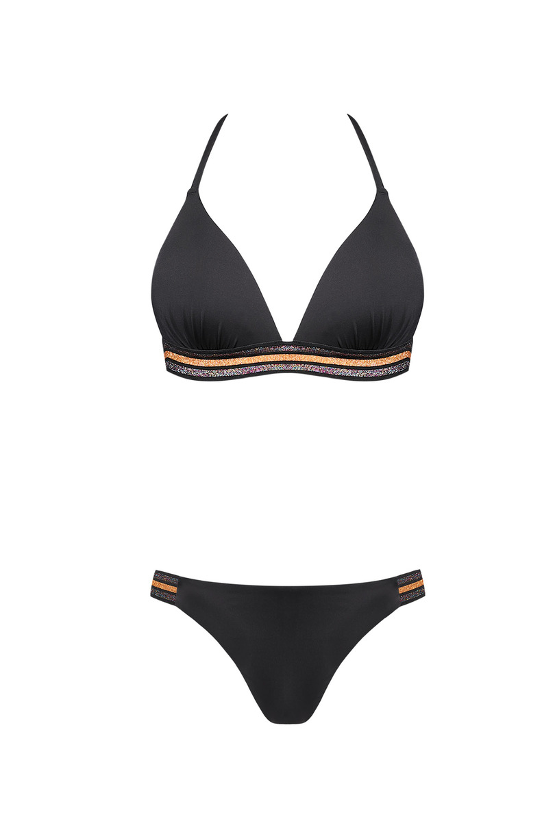 Спокусливий двосекційний купальник з лінійки Cosmo. Виготовлений з чорної тканини та мерехтливої еластичної вставки, цей бюстгальтер у стилі бікіні має злегка контуровані чашечки з підкладкою. Він зав'язується на горловині та застібається ззаду. У комплект входять плавки з бретельками з боків. Склад: 90% поліамід, 10% еластан