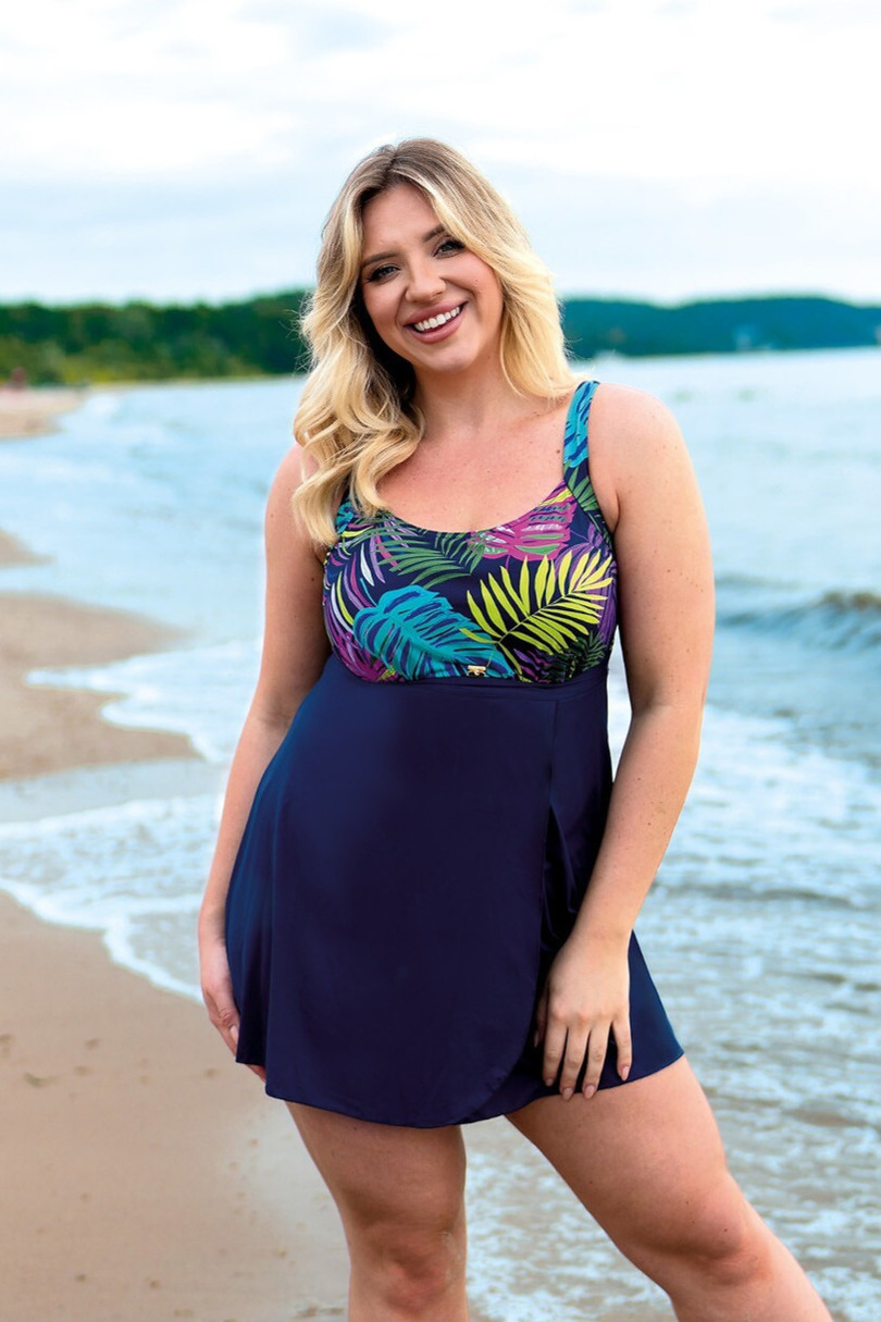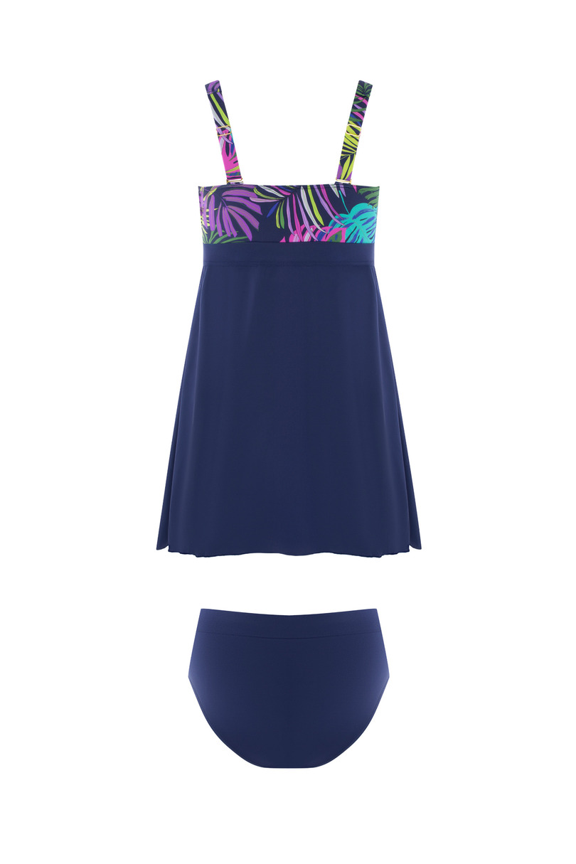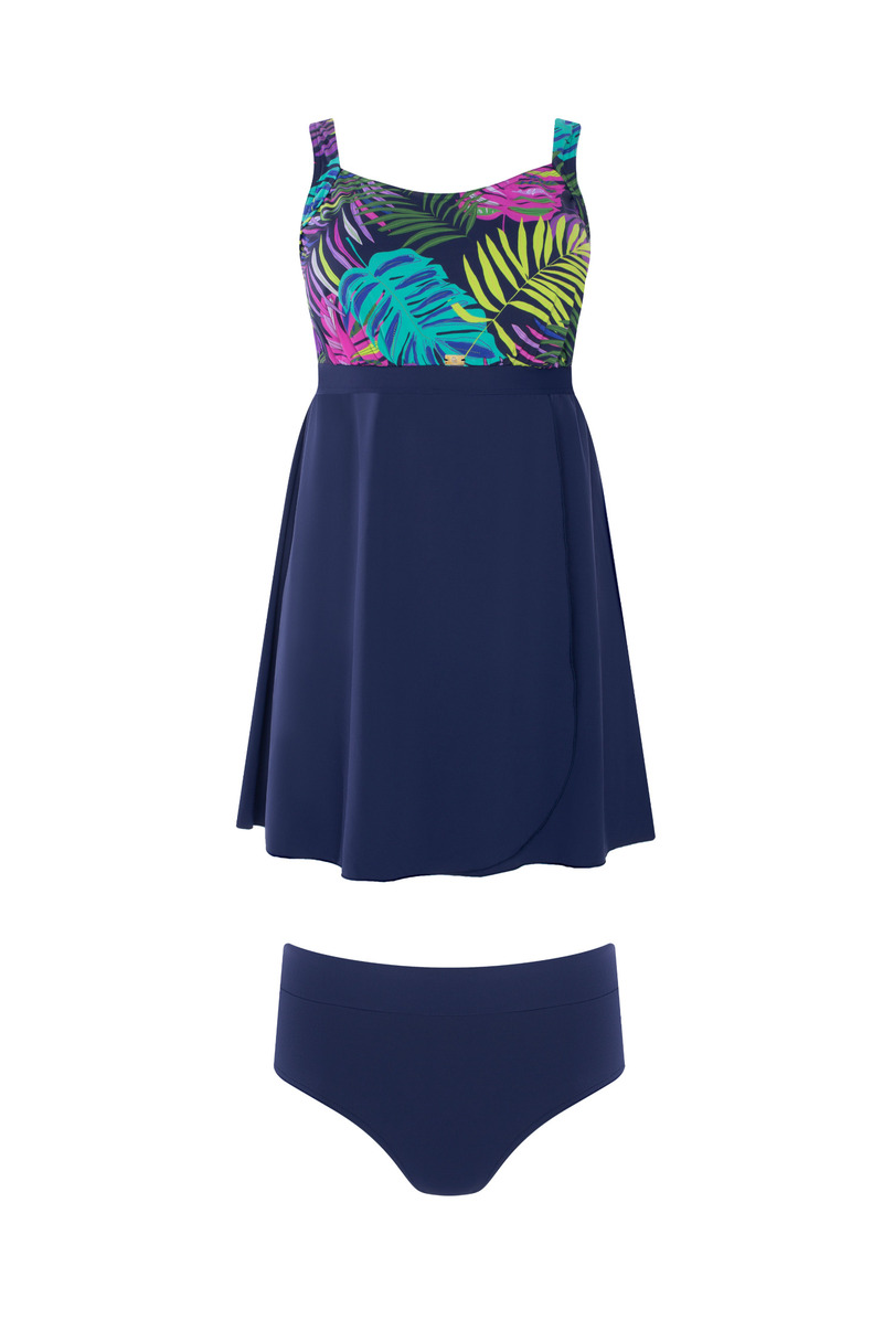 Модель LIMASSOL 5 S687V3LI5 – це надзвичайно жіночний та зручний двосекційний купальник з ефектною спідницею, ідеальний для жінок, які цінують стиль та комфорт. Бюстгальтер на кісточках з жорсткими чашками гарантує оптимальну підтримку бюста, а широкі регульовані бретельки забезпечують комфорт та індивідуальну посадку. Верхня частина привертає увагу енергійним принтом тропічного листя, який контрастує з однотонною темно-синьою спідницею. Спідниця маскує стегна та стегна, надаючи силуету легкості та витонченості. Комплект включає класичні плавки з пишними боками, які забезпечують повне покриття та комфорт. Хлорстійкий матеріал робить купальник придатним як для пляжу, так і для басейну, довго зберігаючи свої кольори та форму. Склад: 85% поліамід, 15% еластан
