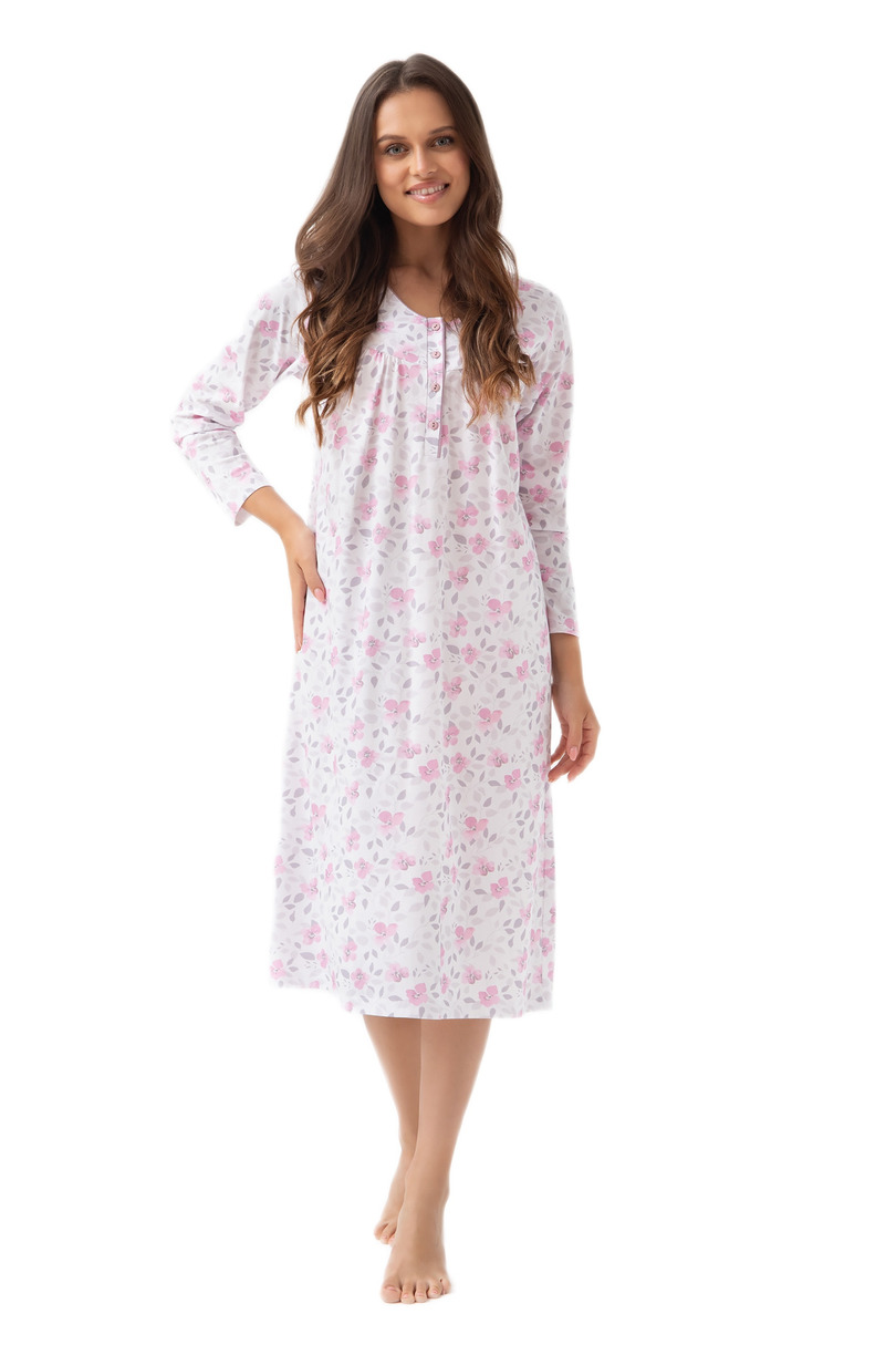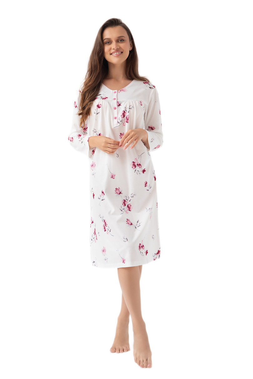 Жіноча нічна сорочка Luna 338 J/25 BIG – це втілення жіночного стилю та комфорту. Квітковий візерунок та вільний крій забезпечують свободу рухів та задоволення від носіння. Ніжний V-подібний виріз з легким заокругленням та зібрана кокетка додають витонченого шарму. Застібка на чотири ґудзики дозволяє легко одягати її, а довжина до коліна робить нічну сорочку ідеальною для будь-якої пори року. Виготовлена з найякіснішої 100% бавовни, вона гарантує комфортний сон та природну повітропроникність.