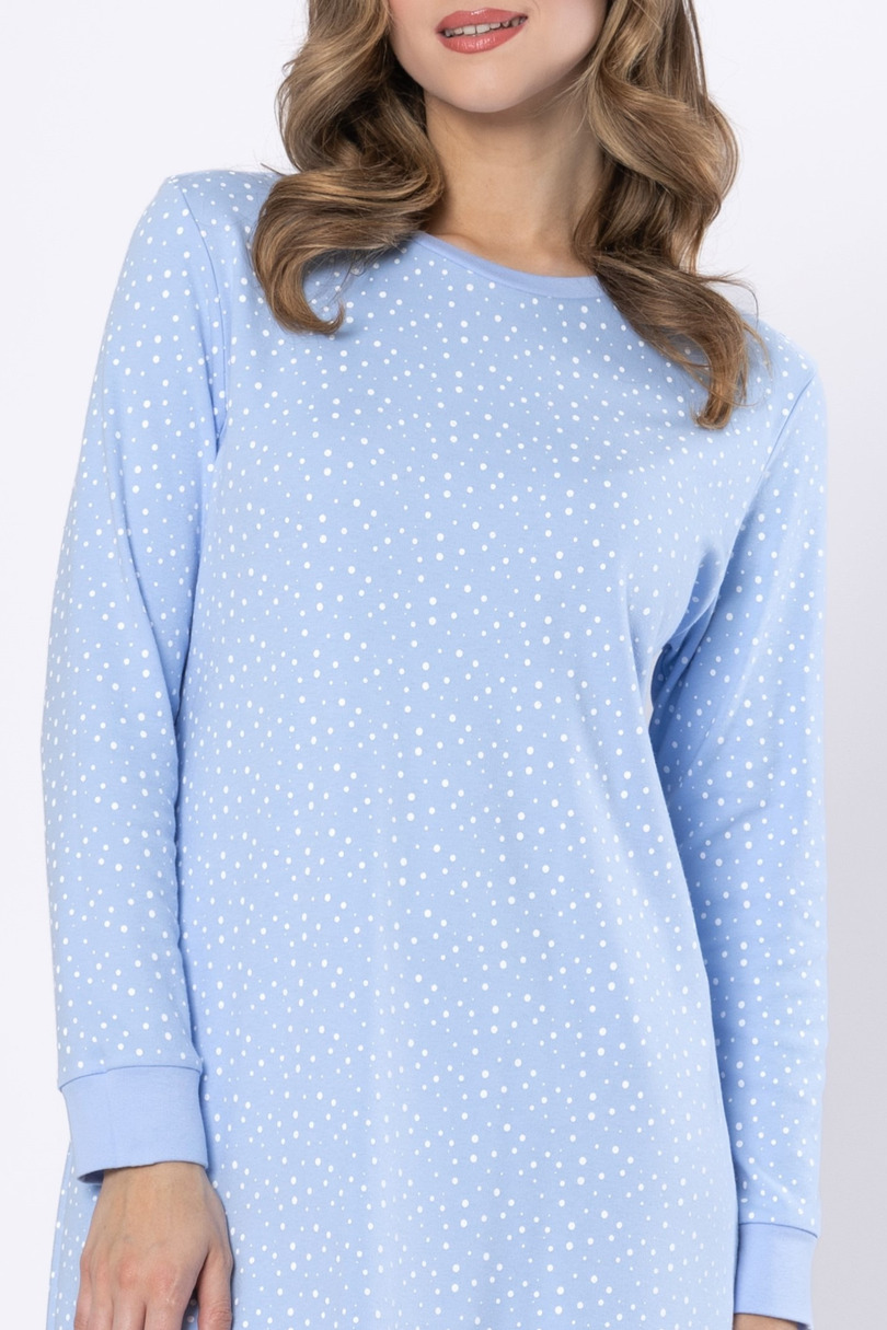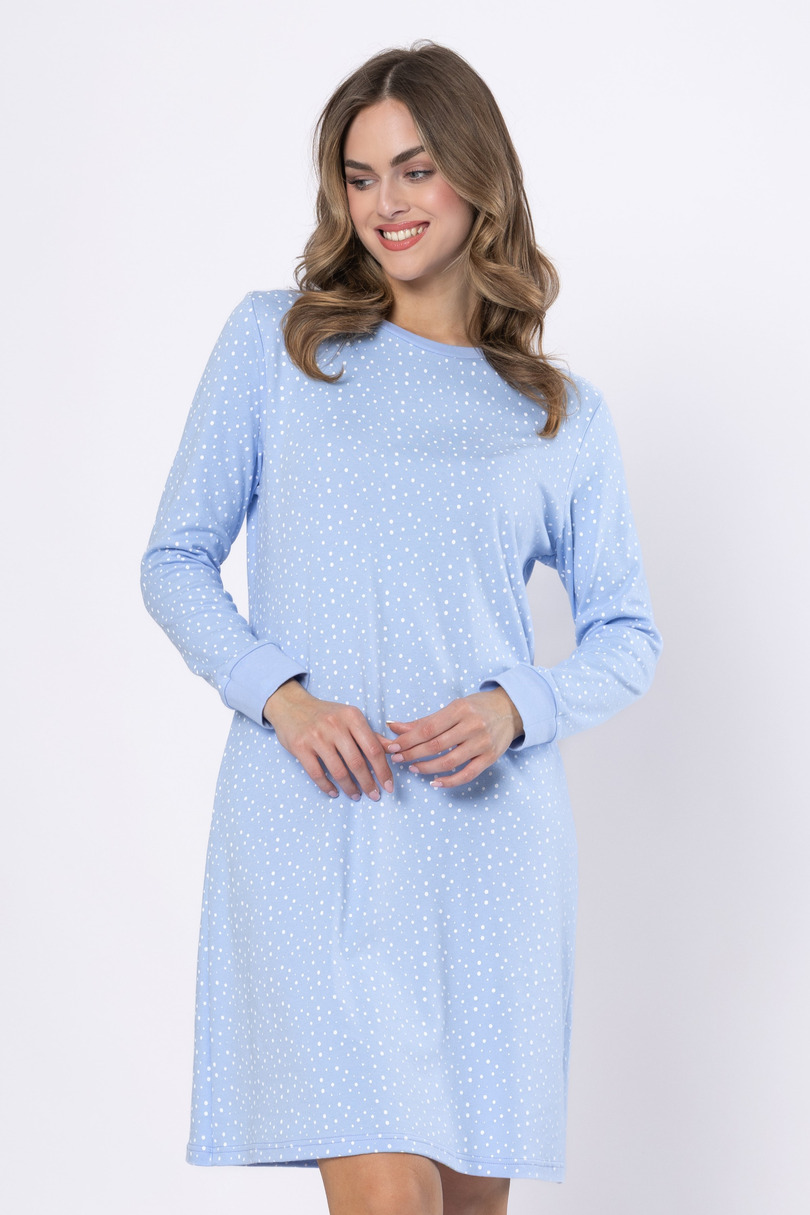 Жіноча сорочка KRYSPINA 1659 від Leveza поєднує в собі комфорт, елегантність та преміальну майстерність. Виготовлена зі 100% натуральної щільної бавовни (180 г/м²), вона пропонує виняткову м'якість, повітропроникність та довговічність. Вона має класичний круглий виріз горловини, довгі рукави з ребристими манжетами та жіночний крій трохи вище коліна. Чорнильно-блакитний візерунок у нерівний горошок додає легкості та витонченого шарму. Ідеально підходить як нічна сорочка або зручний домашній одяг, вона чудово підійде як для прохолодних вечорів, так і для тихих ранків.